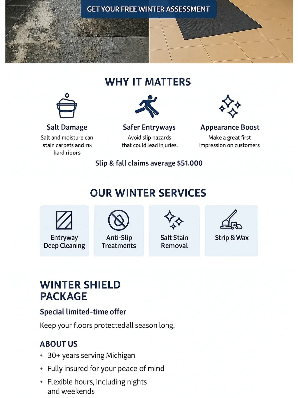 - Extra care for lobbies, hallways, and entrances where snow and debris accumulate.